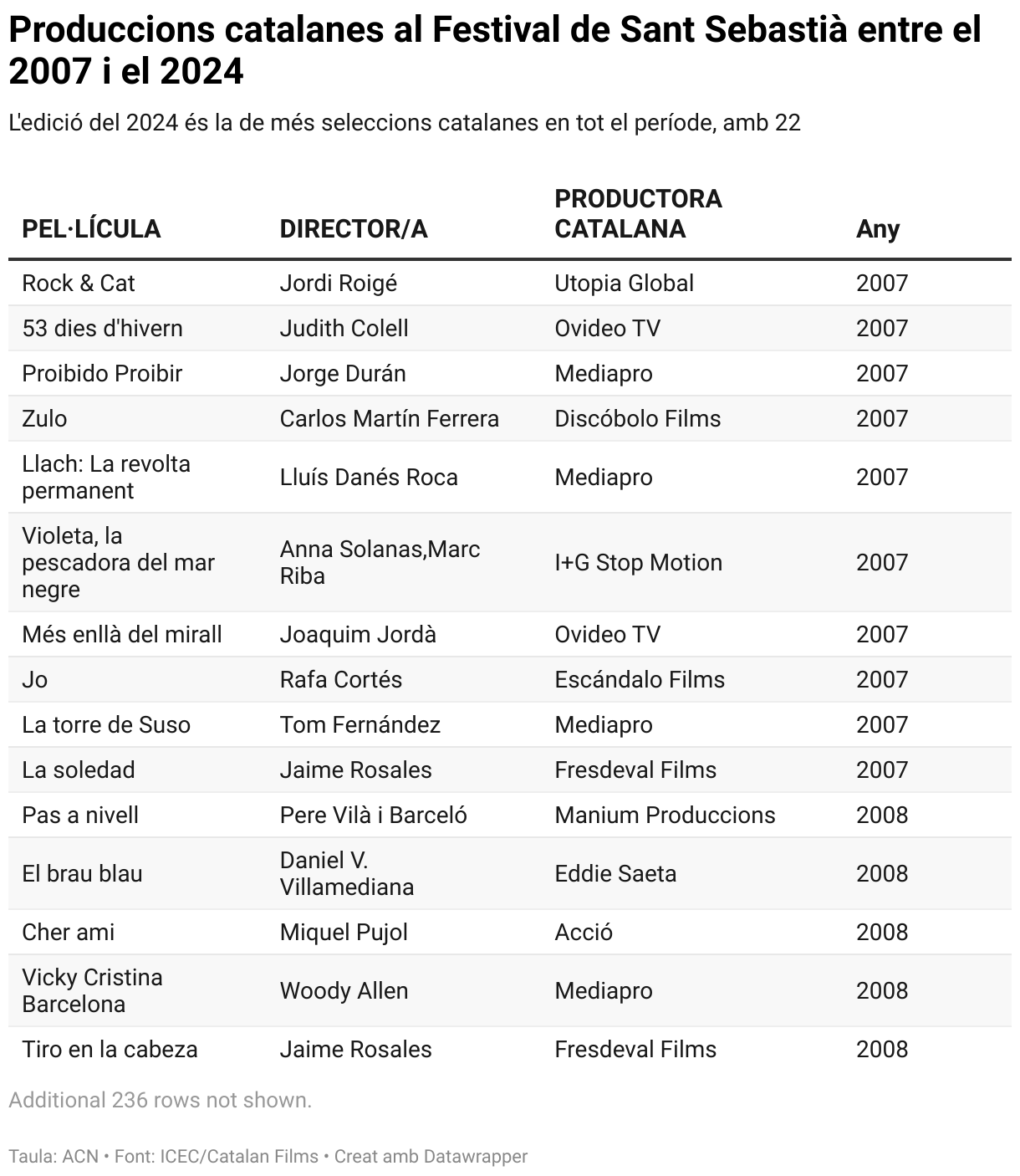 En conjunt, en les últimes 18 edicions del festival, s'han presentat 251 obres de productores catalanes, i Isaki Lacuesta torna a sobresortir, ja que és el director amb més presència: vuit de les seves pel·lícules han estat seleccionades per la mostra al llarg dels anys, com ara Los condenados (Benecé Produccions), del 2009, o bé Un año, una noche (La Termita Films), del 2022. El segueixen Jaime Rosales, amb cinc –com Girasoles silvestres (A Contracorriente Films)–, fa dos anys, i Isabel Coixet també amb cinc –amb Un amor (Monte Glauco AIE) com la més recent. Agustí Villaronga, Cesc Gay i Elena Trapé són els cineastes que els segueixen, amb quatre llargmetratges cadascun en aquest període.