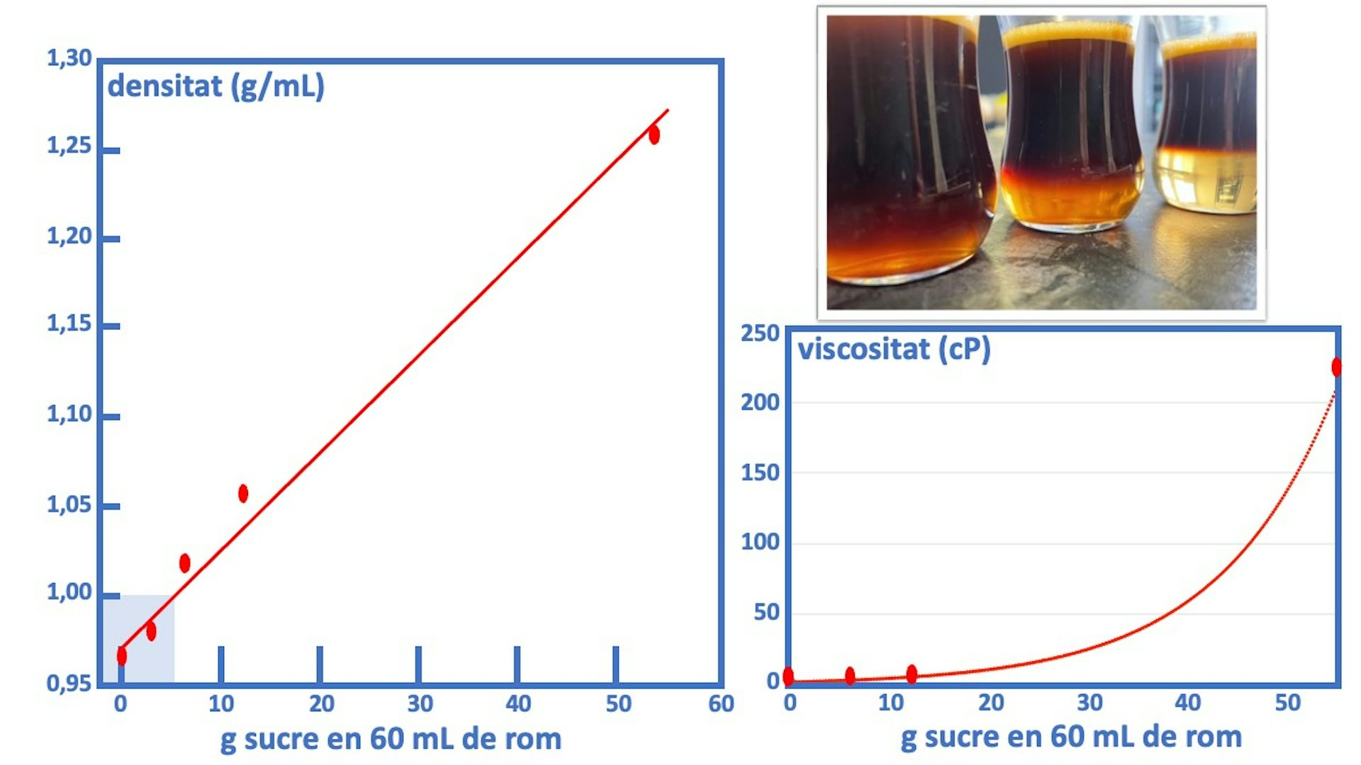 De les 32 receptes de cremaet analitzades, només dos usen la quantitat mínima de sucre necessària per a que el cafè sure sobre el rom (densitat lleugerament superior a 1,00 g/mL). La resta utilitzen quantitats de sucre molt superiors a les necessàries per garantir l’estructura en capes. De fet, són quantitats excessives, incloent algunes que recomanen volums iguals de sucre i rom (equivalent a 55g de sucre en 60 mL).