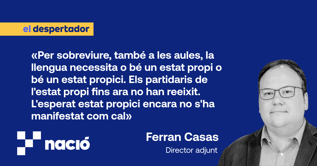 El Govern i els mestres tenen, més enllà d'altres dificultats, eines limitades davant les andanades de la Justícia i d'un marc legal espanyol sempre de rang superior i que no facilita la preeminència (i a vegades ni tan sols la igualtat) del català enlloc. Encara que sigui científicament aconsellable. Sigui a l'escola, per fer de xofer al Parlament, per exercir de metge o de jutge a Catalunya, o per catalanitzar-se el nom al registre civil tal com us hem explicat a Nació. El conseller de Política Lingüística, el catedràtic Francesc Xavier Vila, sempre diu que el català, per sobreviure, necessita o bé un estat propi o bé un estat propici. Els partidaris de l'estat propi fins ara no han reeixit. L'esperat estat propici encara no s'ha manifestat per garantir l'escola en català.