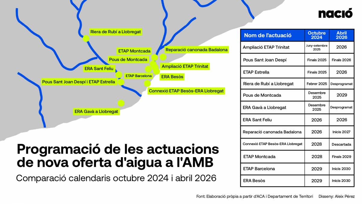 En canvi, s’han desprogramat -ja no es consideren urgents- dues actuacions més: l’aportació d’aigua de l’estació de regeneració de Gavà al Llobregat (prevista per a finals del 2025), així com la provinent de la riera de Rubí. A més, s’ha descartat la connexió entre la depuradora del Besòs i la del Llobregat per incrementar el cabal d’aigua regenerada. Finalment, els pous de Montcada -marcats inicialment per l’any passat- no es realitzaran abans del 2029, segons ha confirmat l’ACA a Nació.