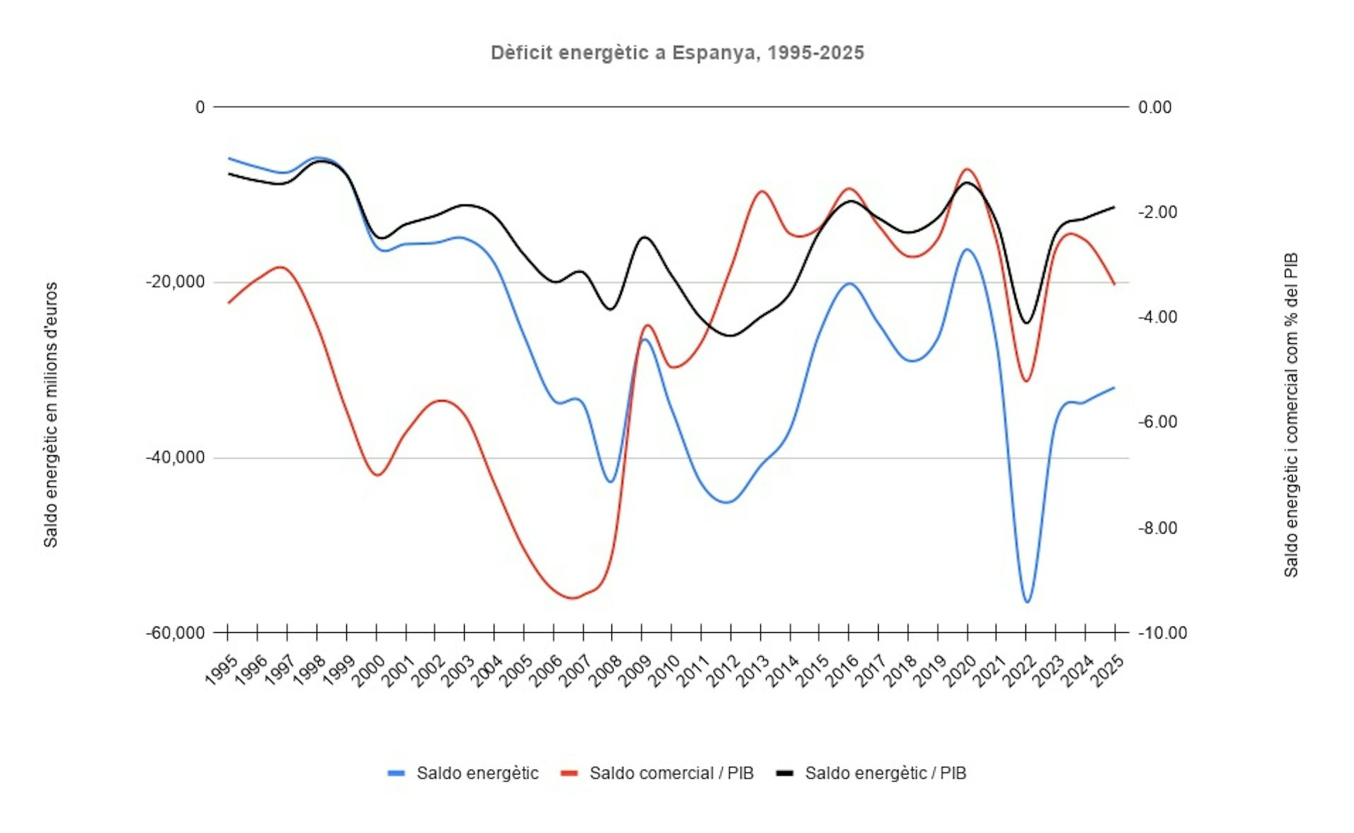 Només Malta, Grècia i Itàlia depenen més de l'exterior dins la UE. Aquesta vulnerabilitat es mesura en euros: entre 1995 i 2024, el saldo energètic negatiu acumulat supera els 730 000 milions d'euros.