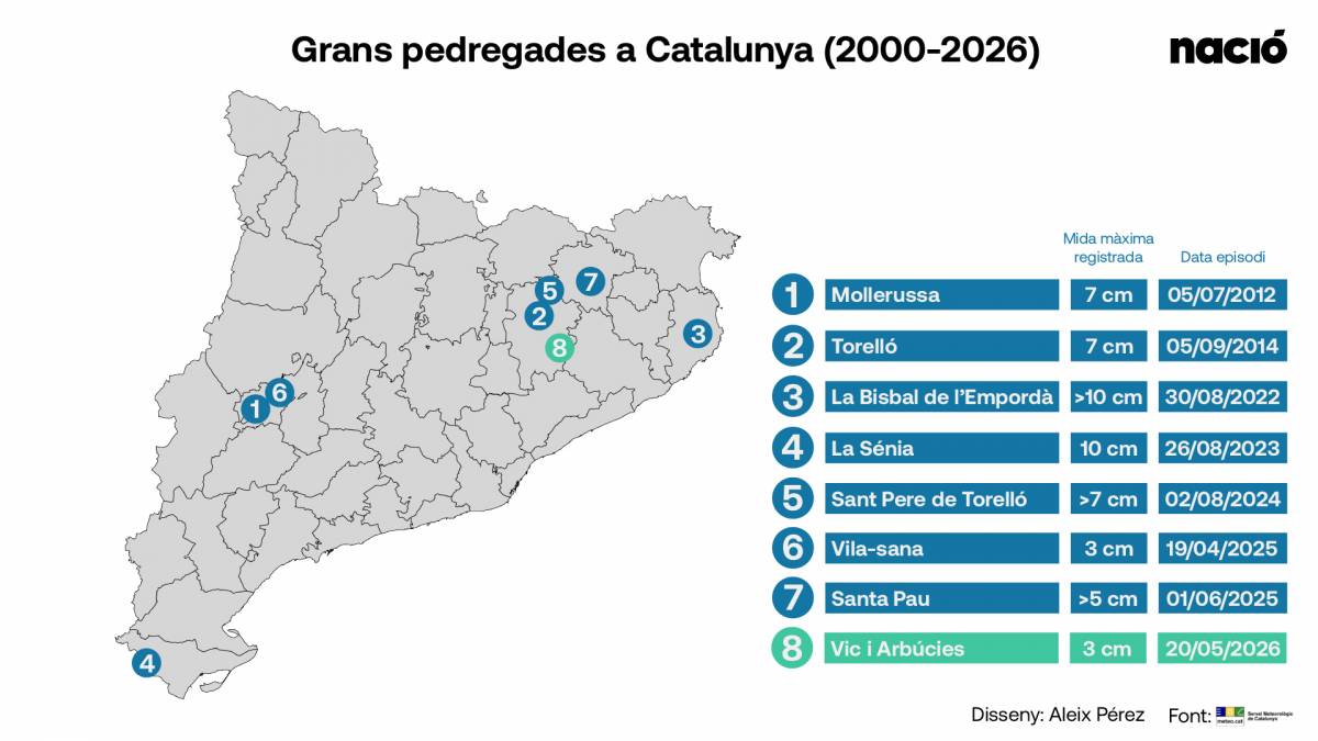 La pedregada d'aquest dilluns, en canvi, a banda d'arribar d'hora en el calendari, va destacar pel gran nombre de pedres de 2,5 i 3 centímetres recollides. La mateixa Farnell no descarta que se'n registrés alguna d'encara més grossa. “No és un rècord, però és un episodi rellevant”, destaca a Nació. Destaquen grans de 3 centímetres al nord de Vic i a Gurb (Osona) i de 2,8 a Arbúcies (la Selva). També de 2 cm a Viladrau (Osona), 1 cm a Raimat (Segrià) i 0,5 a la Seu d'Urgell.
