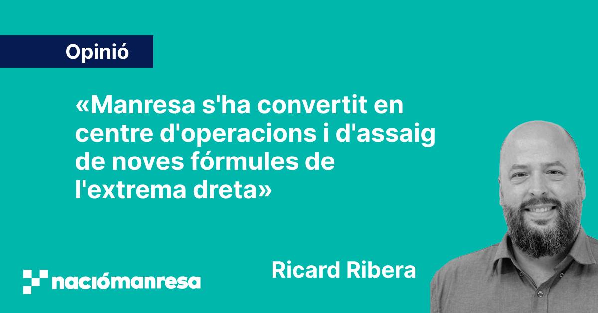 Els últims mesos, Manresa s'ha convertit en el centre dels titulars sobre l'extrema dreta, que en les seves diferents formes pren a la nostra ciutat, convertint-la en centre d'operacions i d'assaig de noves fórmules. Fa uns dies la regidora de Vox, Inmaculada Cervilla, va ser expulsada del ple municipal per l'alcalde Aloy per fer discursos d'odi descaradament, fet que va saltar als mitjans, però que no és una novetat en la manera d'actuar del feixisme espanyolista d'arrel franquista. El que em preocupa realment són els avenços d'altres extremes dretes, com Aliança Catalana i Avenç Nacionalista (els ex de Front Nacional de Catalunya), de la mà dels moviments de Junts per Catalunya i el seu líder Ramon Bacardit.