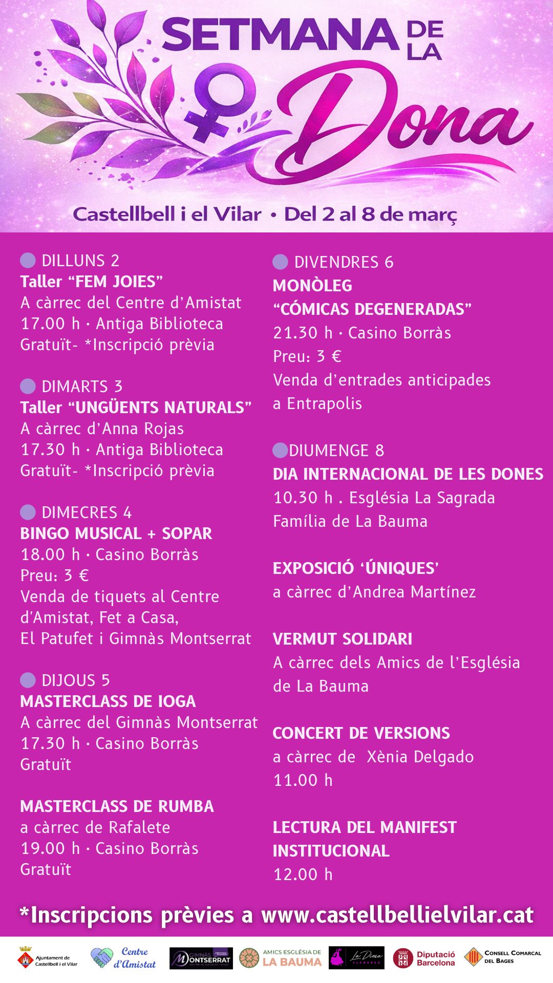 L'Ajuntament de Castellbell i el Vilar donarà el tret de sortida dilluns als actes de la Setmana de la Dona, amb un programa que s'allargarà fins el diumenge 8 de març, coincidint amb la commemoració del Dia Internacional de les Dones.