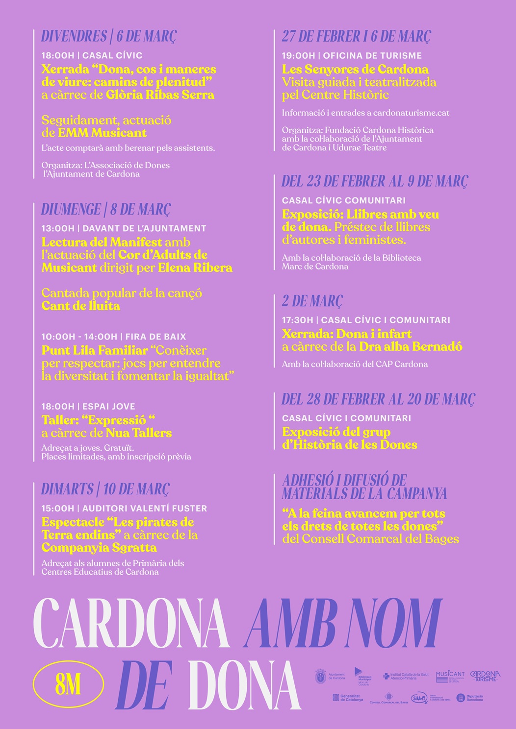 El programa arrenca el 2 de març amb la xerrada Dona i infart, centrada en la salut cardiovascular femenina, al Casal Cívic i Comunitari amb la col·laboració del CAP Cardona. El 6 de març, el mateix espai acollirà la Festa del Dia de la Dona, amb una conferència de Glòria Ribas Serra sobre identitat, autoestima i diversitat funcional, una actuació de l'Escola Municipal de Música Musicant i un berenar obert.