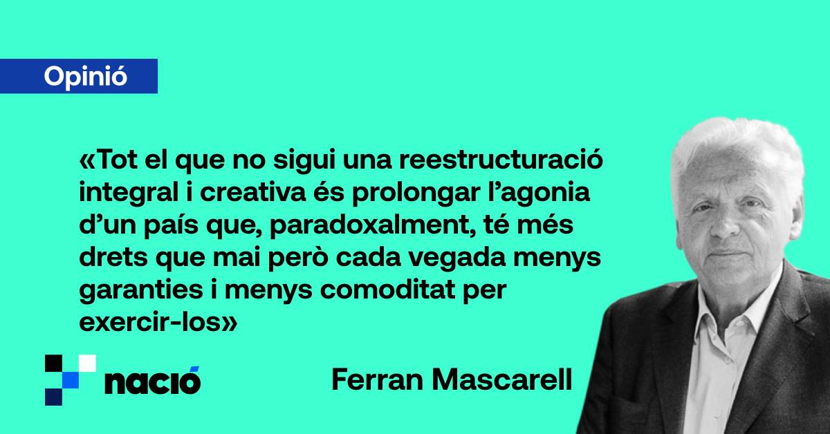 Tot el que no sigui una reestructuració integral i creativa és prolongar l’agonia d’un país que, paradoxalment, té més drets que mai però cada vegada menys garanties i menys comoditat per exercir-los. I, al meu entendre, o bé l’independentisme és capaç de canviar el pas, renovar l’ideari i posar-s’hi al davant del país que pot ser, o la societat continuarà encallada, estressada i angoixada.