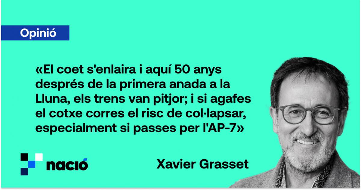 Escarxofats al sofà per veure aquest espectacle d'anar més lluny, sempre molt més lluny, mentre aquí no arribem ja no et dic a Ítaca sinó a la cantonada. El coet s'enlaira i aquí 50 anys després de la primera anada a la Lluna, els trens van pitjor; i tant és Rodalies com l'alta velocitat, i si agafes el cotxe corres (sense córrer) el risc de col·lapsar, especialment si passes per l'AP-7 en qualsevol de les fases de l'operació sortida d'aquests dies de festa. Només cal que ho adobem amb les imatges de la violència gratuïta dels nostres joves per acabar pensant que aquí arribarem a l'edat de pedra abans que ho facin els perses via Trump.