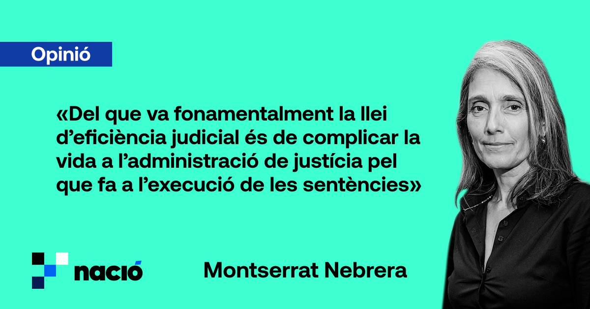 La llei d’eficiència judicial no fa el que es diu que fa, però tampoc el que diu que farà. Del que va fonamentalment la llei d’eficiència judicial, que tants retrets ha tingut per part de tots els col·lectius jurídics implicats, és de complicar la vida a l’administració de justícia pel que fa a l’execució de les sentències, perquè el que potser serà una bona notícia en partits judicials més petits, en els grans pot generar més caos i retards que bones notícies per als justiciables (excepte, altre cop, si es tracta del demandat, clar...). No crec que estalviï diners, ans al contrari, la demora continuarà en una altra fase, la més important, el que equival a molts diners esmerçats. Això sí, com fora desitjable, no s’inverteix de veritat en la connexió de jutjats i la implementació de la intel·ligència artificial, com a mínim en les qüestions mecàniques. Però ja se sap que això generaria un altre problema, el de la massa de gent que fora prescindible, al que els poders públics no es volen enfrontar. Ja en tenen prou amb un atur estructural molt per sobre de la mitja europea.