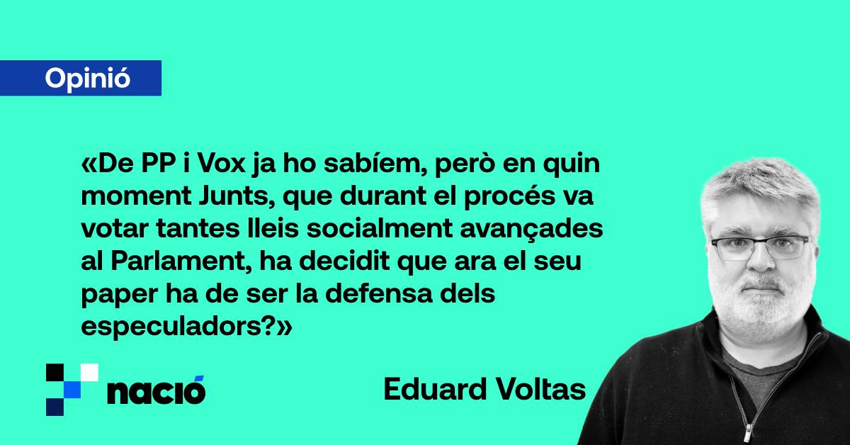 El mateix dia que Junts, PP i Vox van rebutjar el decret d’Òmnibus, el lobby dels grans propietaris immobiliaris de Catalunya, Som Habitatge, va emetre un comunicat agraint “la coherència, el coratge i la fermesa” d’aquestes forces polítiques. Quina mena de coratge polític o humà és aquest que, quan ha de triar entre els interessos de gent molt rica i la protecció de gent molt pobra i desesperada, s’inclina per defensar els interessos dels primers? De PP i Vox ja ho sabíem, però en quin moment Junts, que durant el procés va votar tantes lleis socialment avançades al Parlament, ha decidit que ara, en matèria d’habitatge, el seu paper ha de ser la defensa dels especuladors?