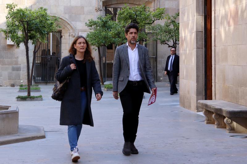 - La presidenta dels Comuns al Parlament, Jéssica Albiach, i el portaveu, David Cid, arriben a la cimera per abordar les conseqüències de la guerra a l'Orient Mitjà, al Palau de la Generalitat.