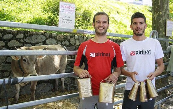 Els germans Camprubí amb els sis premis i la gran campiona de la Fira del Bestiar. Foto: Arnau Urgell Fins a sis vegades es va escoltar “Cal Govern de les Llosses” a l'entrega de premis de la Fira del Bestiar de Ribes de Freser que es va celebrar aquest dissabte al passeig de la Margarideta. La ramaderia Pirinat, dels germans Camprubí, va arrasar ja que va acaparar sis premis entre els qual el de la gran campiona del certamen, succeint a cal Roset de Campdevànol. A més,van presentar la millor vedella d'un any i la millor brava.