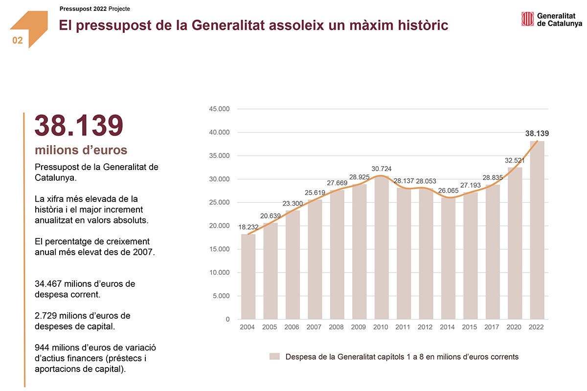 Cal subratllar que, malgrat l’increment del dèficit públic, el pes del deute català sobre el PIB es redueix en 2,2 punts respecte el 2021, ja que el bon ritme del creixement econòmic fa més sostenible l’endeutament de la Generalitat.